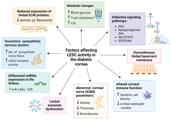 Factors which influence LESC function in diabetes. Each factor is associated with a significant reduction in the expression of putative LESC markers in studies that employ organ-cultured diabetic human corneas, diabetic LECs and mouse models of diabetes. Upward arrow () represents “increase in”; Downward arrow () represents “decrease in”. Figure generated with BioRender.com.