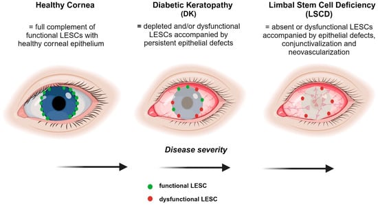 Despite current evidence highlighting the loss and/or dysfunction of LESCs in diabetes, there is scant in vivo functional data implicating these insufficiencies as being responsible for DK [62]. If it were the case, and because diabetes is a chronic systemic disease, then continuous loss of LESCs and disturbances in their activity are anticipated, potentially resulting in more severe manifestations similar to the pathological fibrovascular conjunctival tissue that enshrouds the cornea in LSCD [61]. Nonetheless, given that patients with early-stage diabetes do not meet diagnostic criteria for LSCD, regardless of LESC depletion [62], longitudinal studies are needed to identify diagnostic markers of this disease and the potential risks of developing LSCD over time. Conjunctivalization and neovascularization are two cardinal features of LSCD which have not been reported in patients with diabetes, even though they have been suggested [62]. However, severe non-resolving corneal epithelial defects are apparent in LSCD, which are similar to lesions that develop on the ocular surface of patients with diabetes [10,11,12]. Therefore, in diabetes, it is likely that a defined number, or indeed a specific population of LESCs, is depleted with sufficient stocks retained to preserve limbal barrier function and prevent conjunctival incursion into the cornea (Figure 4). Because epithelial defects on the corneal surface can persevere in DK, it is also tempting to speculate that LESC activity is exhausted, especially if their longevity is cut short by intrinsic factors that would otherwise be exquisitely regulated under homeostatic conditions. Moreover, unlike LSCD, LESC function in DK may be secondarily exacerbated as a consequence of compromised corneal sensitivity and innervation due to co-existing retinal conditions in patients with diabetes [120]. Notably, persistent epithelial defects such as neurotrophic keratopathy can develop after shaving or ablating the epithelium prior to retinal laser photocoagulation [121] or potentially due to thermal burns following laser refractive surgery [122] after which they may not fully regenerate [123]. Therefore, investigating such anomalies on a hyperglycemic background may shed new light into the pathobiology of LESCs within the diabetic cornea. Alternatively, metabolic inequities could modify the limbal microenvironment and encourage remaining LESCs to enter an abnormal state for which there are emerging biological, pharmacological, genetic, and other interventions to correct their status and restore ocular surface health and sight.