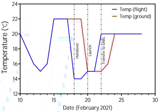 Wild-type (wt) Bristol isolate (N2 []) and dystrophin (dys-1) mutant (BZ33 []) worms were maintained in C. elegans Maintenance Medium (CeMM) [], purchased on contract from Cell Guidance Systems, Cambridge, UK. Cultures were established as previously described [] and maintained at two separate sites (Texas Tech University, USA and University of Nottingham, UK). Ten days before the launch, approximately 1000 larvae from a stock culture were transferred into a Fluorinated Ethylene Propylene (FEP) bag (Saint Gobain Performance Plastics Corporation, Solon, OH, USA) containing 20 mL CeMM at Texas Tech University (TTU). These primary culture bags and CeMM-Filled FEP bags were shipped to the Eastern Virginia Medical School (EVMS), Norfolk, on 10th February 2021. The culture bags were shipped with phase change material [] at a temperature of 16 ± 2 °C. Upon arrival (following a lengthy delay of shipment in transit due to poor weather), culture bags were inspected for contamination and stored in the incubator at 22 °C for 2 days (flight bags) and 4 days (ground bags). The flight bags were handed over to NASA cold stowage on 17th February 2021 at a temperature of 15 ± 1 °C for the 20th February 2021 NG-15 launch. Ground control bags were sent to TTU, and the temperature profile of flight bags was replicated on a time delay of two days (Figure 1). Upon arrival at the ISS, the culture bags were incubated at 20 °C, and the CeMM bags were stored at 4 °C. Cultures were incubated for a week in microgravity before initiating the multigenerational culturing outlined in []. Briefly, 1 mL of culture was transferred to a fresh FEP bag containing CeMM every 2 weeks. All experiments used a starting mixed population of well-fed animals, with force measurements only being made on gravid adults. Upon experiment completion, ground bags at TTU were frozen and stored at −80 °C, while flight bags were frozen in the ISS MELFI at −80 °C until download to Earth via NASA cold stowage at −20 °C, followed by dry ice transport to TTU for storage at −80 °C.