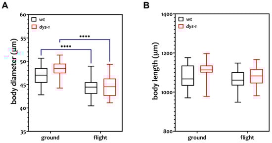 Effect of spaceflight on body diameter and length of wt and dys-1 worms. (A) body diameter (B) body length. The diameters of both the strains grown at ISS are significantly different compared to ground controls, whereas there is no difference in the length of the worms. Sample size: n = 30 for wt ground and flight, n = 25 for dys-1 ground, and n = 29 for dys-1 flight. All the data pass the normality test. We used two-way ANOVA (Tukey multiple testing) for calculating significant differences; p < 0.001 is for ****.