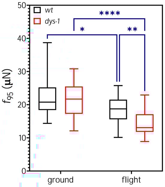 Strength was measured in the second generation in flight to reflect strength in worms wholly developed onboard ISS and with in-flight loading methods and video quality that had been tested on first generation from Earth prior to use with the experimental time point. To measure adult worms’ muscle strength, a 60-s-long video of crawling worms in NemaFlex-S chambers was recorded. The recorded videos were analyzed, and we identified the pillar with the maximal deflection in each image and generated a cumulative probability distribution with all the maximal deflections, as previously described []. We use the 95th percentile of this maximal force distribution, referred to as , as a measure of muscle strength. As shown in Figure 3, on Earth, gravid adult dys-1 worms are not significantly weaker than wt. This is consistent with previous reports where dys-1 mutants only display strength deficits vs. wt post day 1 of adulthood [].