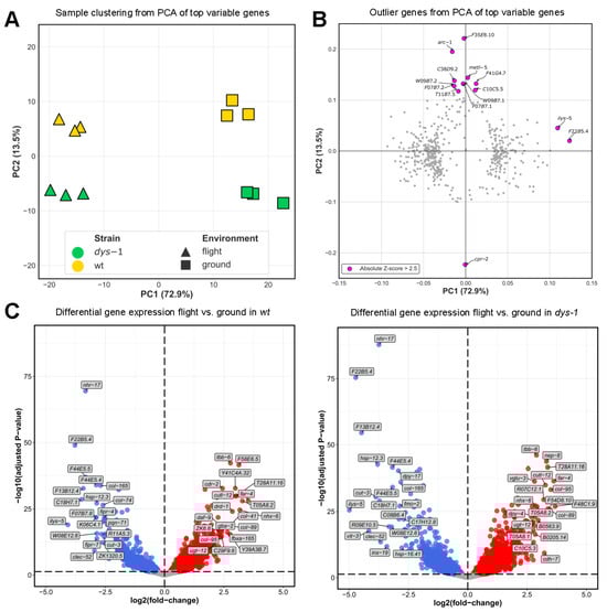 Global trends in spaceflight gene expression. (A) PCA clustering of samples based on top 500 most variable genes, (B) PCA loadings of top 500 most variable genes, (C) Volcano plots for wt flight vs. wt ground and dys-1 flight vs. dys-1 ground differential expression analyses. Annotated genes in each case are those ranked in the top 20 upregulated/downregulated based on log2 fold-change.