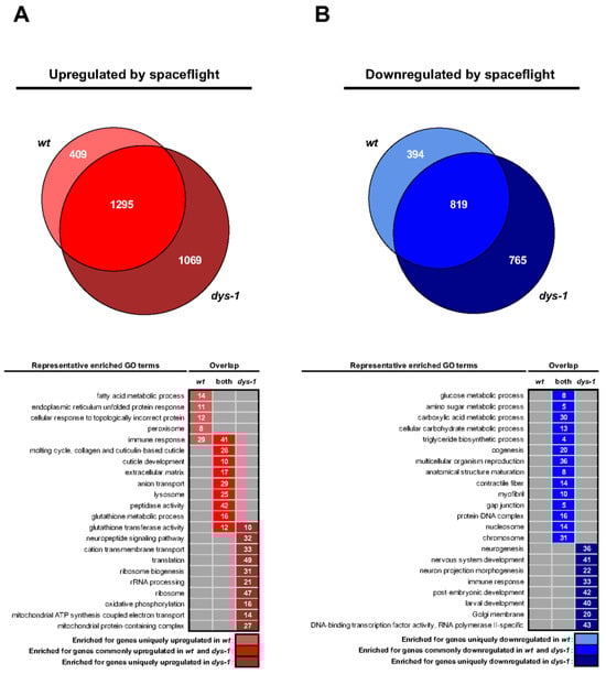 Overlay of wt and dys-1 transcriptome responses to spaceflight. (A) Overlay of genes upregulated by spaceflight in wt and/or dys-1 worms. Venn diagram illustrates the degree of commonality/uniqueness in spaceflight-upregulated genes between the two strains, while the heatmap depicts representative Gene Ontology (GO) terms for common/uniquely upregulated genes up in flight. Venn shows the commonality and differential changes in wt vs. dys-1. The able displays common and differential GO expression in wt vs. dys-1 (B) As per panel A but for genes downregulated by spaceflight.