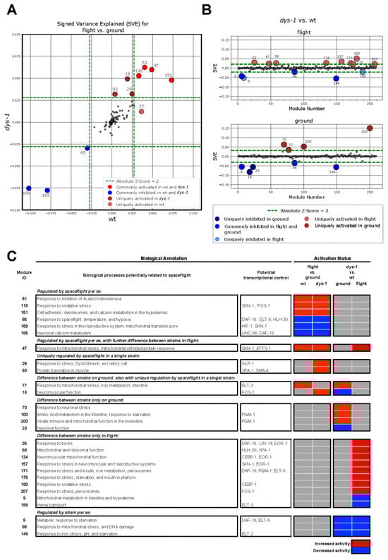 Cluster analysis to identify coexpressed gene modules. (A) Activity of gene co-expression modules in flight vs. ground control comparison. (B) Activity of gene co-expression modules in dys-1 vs. wt comparisons. (C) Table of module annotations and summarized activation between pairwise comparisons.