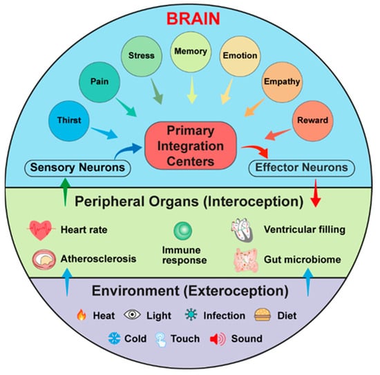 Neurobiology distinguishes signals that are derived from the body (interoception), including the genetic makeup of each individual and those that are derived from the environment (exteroception) including heat, cold, bacterial infections, and numerous environmentally defined cues (Figure 2). While the genetic makeup in a given study of experimental mice is identical, each human owns its individual interoceptive pathways based on the combination of functionally relevant genetic mutations and the acquired interoceptive brain engrams during their lifetimes [,,,]. The interoceptive pathways can either prevent or accelerate diseases, as shown for a series of genetic mutations that affect diseases as diverse as multiple types of cancer, disease sensitivities due to mutations of genes controlling the immune system, but also CVDs and dementia, such as mutations in the transport of lipids (Apolipoprotein E isoforms; low-density lipoprotein receptor mutations and other lipid transport-relevant genes are examples of numerous mutations affecting the cardiovascular system), and more will be discovered through genome-wide association studies [,]. On the other side of the interoception–exteroception pair, body surfaces including the skin, the lung, and the gut harbor sensory receptors such as members of the transient receptor potential channel V1 that had been discovered as a temperature receptor by David Julius [,], and other members of the transient receptor potential family, in addition to Piezo1 and Piezo2 serving as stretch receptors, discovered by Ardem Patapoutian []. Many of these inputs project to the brain stem []. Exteroception pathways that impact the CBC and, in particular, CVD pathogenesis clearly need to consider risk factor profiles, including those rendered by dietary habits, body weight, sedentary lifestyles, smoking, and multiple types of disease-promoting forms of environmental and internal body challenges that are referred to stress by some scholars [,,,,].