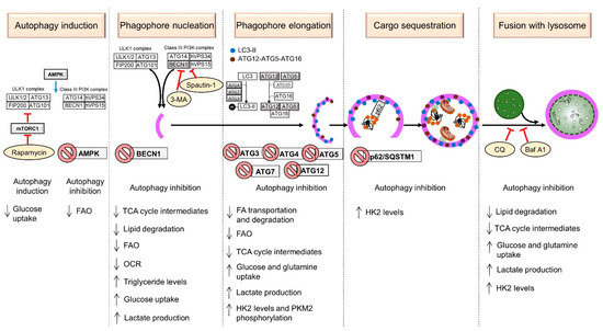 Remarkably, deletion of ATG3, which is necessary for LC3 lipidation, or ATG12, which, in complex with ATG5, is required for the elongation of phagophores, also causes FAO reduction but increases glucose uptake and consumption in AML cell lines [85,110].