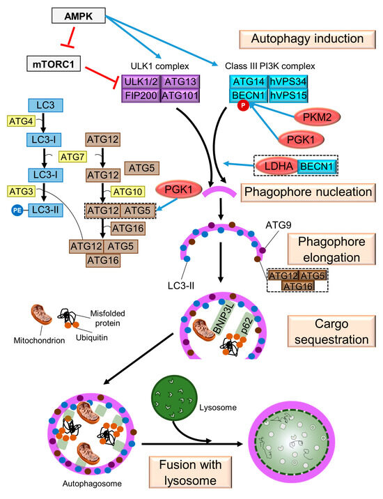 - Qian, X.; Li, X.; Cai, Q.; Zhang, C.; Yu, Q.; Jiang, Y.; Lee, J.H.; Hawke, D.; Wang, Y.; Xia, Y.; et al. Phosphoglycerate Kinase 1 Phosphorylates Beclin1 to Induce Autophagy. Mol. Cell 2017, 65, 917–931.e6. [Google Scholar] [CrossRef] [PubMed]