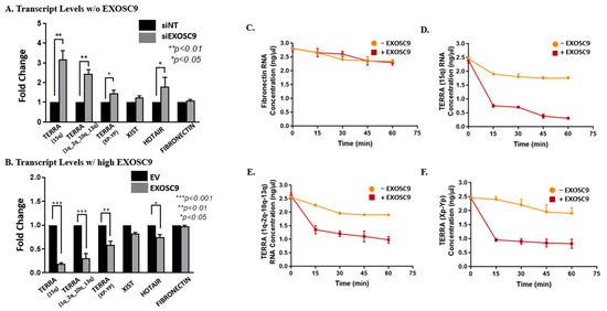 Total RNA was extracted using PureLink RNA Mini Kit (ThermoFisher Scientific), and RNA concentration was measured using Nanodrop. Exoribonuclease assay was prepared using 1 µg of RNA in the reaction buffer (10 mM Tris HCL [PH 8.0], 10 mM DTT, 50 mM KCL, 5 mM MgCl2, 1 U/µL RNase inhibitor) and incubated with/without EXOSC9 recombinant protein (Novus Biological) at 37 °C for different time periods (0 min, 15 min, 30 min, 45 min, and 60 min). The reactions were terminated with RNA purification buffer. RT-qPCR was carried out using the standard curve method, whereby the known concentrations of extracted RNA were prepared, converted to cDNA, and amplified with fibronectin- and TERRA-specific primers (Supplemental Table S1; IDT).
