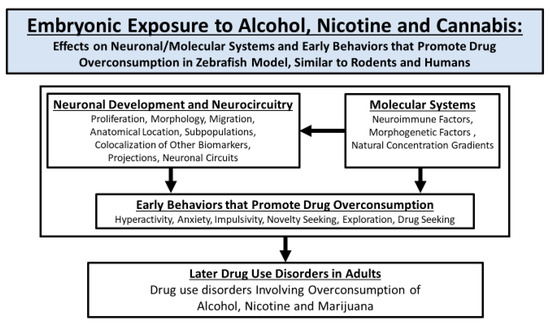 Schematic summarizing the main sections of this review, focusing on the use of zebrafish to study the effects of embryonic exposure to alcohol, nicotine and cannabis on neuronal and molecular systems and early behaviors that promote drug overconsumption. Advanced techniques available to study the direct relation of the brain to behavior in zebrafish after embryonic drug exposure include, for example, optogenetics, chemogenetics, targeted laser ablation, genetic manipulations, calcium imaging, and behavioral screenings. Examples of the use of some of these techniques in the context of embryonic alcohol exposure can be found in our recent studies [3,4,5,6,7].