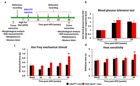 Analysis of hyperglycaemia and behavioural measurements of mice lacking SUMOylation in peripheral nociceptive neurons or control mice in a type 2 model of diabetes in a longitudinal study spanning 30 weeks. (a) Experimental scheme for the used model to induce type 2 diabetes and the time points testing for mechanical sensitivity (von Frey) and heat sensitivity (Hargreaves). (b) Analysis of blood glucose tolerance tests at different stages throughout type 2 diabetes. The area under the curve was analysed. N = 6 mice/genotype; two-way ANOVA test was performed. * p ≤ 0.05 compared to basal. Data are expressed as mean ± SEM. (c,d) Course of DPN-associated changes in the response threshold and thermal latency before and after inducing type 2 diabetes. N = 6 mice/genotype; repeated two-way ANOVA test was performed. * p ≤ 0.05 compared to basal, # p ≤ 0.05 compared to the control group. Data are expressed as mean ± SEM.