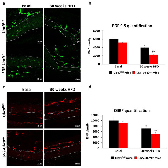 Immunohistochemistry was performed on skin biopsies of the plantar surface of the hind paws from the diabetic and non-diabetic SNS-Ubc9−/− and Ubc9fl/fl mice as basal or 30 weeks post-HFD, as previously described [39,41]. Briefly, the mice were perfused with 4% Paraformaldehyde (PFA), and plantar skin was dissected and post-fixed with 4% PFA for 24 h at 4 °C. The biopsy samples were then incubated in 30% sucrose in 1× phosphate buffer saline (PBS), and 16 µm cryosections were made. The sections were permeabilised with 0.5% PBST, followed by washing, and blocked with 7% horse serum in 1× PBST. Next, the sections were incubated with either anti-calcitonin gene-related peptide (anti-CGRP Sigma-Aldrich, cat. no. C8198, 1:1000) or anti-protein gene product 9.5 (anti-PGP9.5, Dako, Glostrup, Denmark, cat no. Z5116 1:1000) primary antibodies for 48 h at 4 °C. After that, the sections were washed and incubated with Alexa Fluor-488-conjugated secondary antibodies (Thermo Fischer, cat no. A32766, 1:700) for 1 h at room temperature. Finally, the sections were washed and mounted in Mowiol 4–88 (Carl Roth, Karlsruhe, Germany, cat no. 0713.1). Fluorescence images were obtained using a Leica SP8 confocal microscope using identical image-acquiring conditions across different sections and test groups. Acquired images were analysed using Image J software (version 1.8.0_172), as described previously [41]. The epidermal area in the hind paw skin biopsies was marked, and the total fluorescence density over the marked epidermal area was calculated after subtracting the background signal from each test sample [18,42].