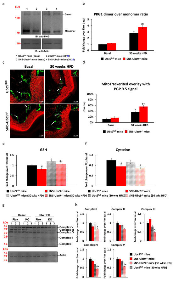 Quantitative analysis of ROS measurements and changes in the electron transport chain in vivo in the DRGs and the paw skin. (a) Western blot analysis of PKG1α expression in SNS-Ubc9−/− and Ubc9fl/fl mice at basal stage and after 30 weeks of type 2 diabetes. (b) Analysis of band intensities using densitometry; dimerized PKG1α was quantified over monomeric PKG1α. N = 3 mice/genotype; two-way ANOVA test was performed. * p ≤ 0.05 compared to basal, # p ≤ 0.05 compared to the control group. Data are expressed as mean ± SEM. (c) Representative pictures of MitoTracker Red staining overlapping with PGP9.5 immunofluorescence stained nerve fibres in the dermis in SNS-Ubc9−/− and Ubc9fl/fl mice at basal stage and after 30 weeks of type 2 diabetes after injection into the paw. Scale bar corresponds to 15 µm. Arrows indicate examples for analysed fibres in the dermis.(d) Quantitative analysis of the MitoTracker Red overlap in PGP9.5 stained nerve fibres. N = 3–4 mice/genotype; two-way ANOVA test was performed. * p ≤ 0.05 compared to basal, # p ≤ 0.05 compared to the control group. Data are expressed as mean ± SEM. (e) Quantitative analysis of GSH levels in the sciatic nerve from SNS-Ubc9−/− and Ubc9fl/fl mice at basal stage and after 30 weeks of type 2 diabetes. N = 5–6 mice/genotype; two-way ANOVA test was performed. * p ≤ 0.05 compared to basal, # p ≤ 0.05 compared to the control group. Data are expressed as mean ± SEM. (f) Quantitative analysis of cysteine levels in the sciatic nerve from SNS-Ubc9−/− and Ubc9fl/fl mice at basal stage and after 30 weeks of type 2 diabetes. N = 5–6 mice/genotype; two-way ANOVA test was performed., # p ≤ 0.05 compared to the control group. Data are expressed as mean ± SEM. (g) Western blot analysis of the expression of different key proteins from the oxidative phosphorylation cascade in SNS-Ubc9−/− and Ubc9fl/fl mice at basal stage and after 30 weeks of type 2 diabetes. Complex I–NDUFB8, Complex II–SDHB, Complex III–UQCRC2, Complex VI–MTCO1, Complex V–ATP5AF1A. (h) Analysis of band intensities using densitometry. N = 3 mice/genotype; two-way ANOVA test was performed. * p ≤ 0.05 compared to basal, # p ≤ 0.05 compared to the control group. Data are expressed as mean ± SEM.