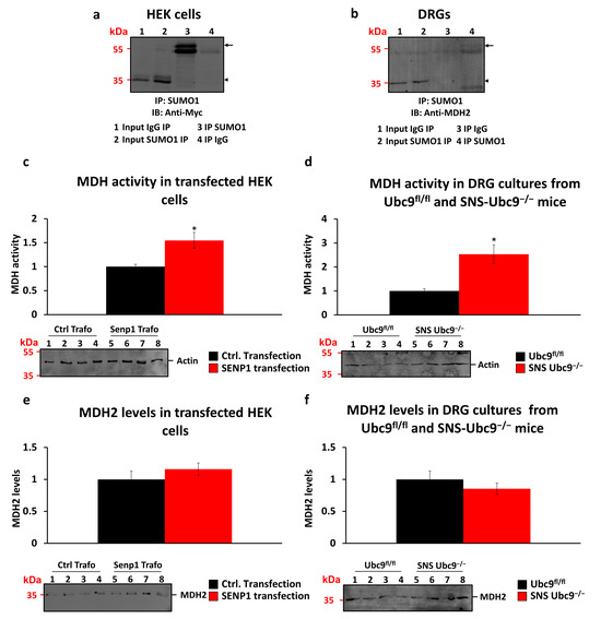 MDH2 is a SUMOylation target and MDH activity is altered by the SUMOylation status. (a) IP of artificial expressed Myc-tagged MDH2 in HEK cells and (b) native MDH2 from DRGs using an anti-SUMO1 antibody. The arrowhead indicates the unSUMOylated MDH2, while the arrow shows the SUMOylated MDH2. (c) MDH activity is increased in HEK cells transfected with a SENP1 expressing plasmid in comparison to control transfected HEK cells, while (e) MDH2 protein levels are not altered. N = 7 for SENP1 and control transfection; Mann–Whitney test was performed. * p ≤ 0.05. Data are expressed as mean ± SEM. (d) MDH activity is increased in DRG cultures obtained from 4-week-old SNS-Ubc9−/− mice in comparison to the ones from Ubc9fl/fl mice. (f) MDH2 protein levels are not altered between genotype. N = 4 mice/genotype; Mann–Whitney test was performed. * p ≤ 0.05. Data are expressed as mean ± SEM.