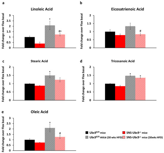 Using LC-MS and MS, we assessed lipid levels in sciatic nerve tissue from SNS-Ubc9−/− and Ubc9fl/fl mice in basal and diabetic states. Linoleic acid and eicosatrienoic acid are crucial omega-6 and omega-3 fatty acids that play vital roles in maintaining neuronal membrane integrity and fluidity, which are essential for proper neuron function [47]. Linoleic acid levels increased with disease progression in wildtype diabetic mice, while SUMO-deficient mice consistently exhibited significantly lower linoleic acid levels post30 weeks of HFD compared to control mice (Figure 5a). Similarly, eicosatrienoic acid levels were significantly lower in diabetic SNS-Ubc9−/− mice compared to controls (Figure 5b). Reduced levels of these acids may render the neuronal membrane vulnerable to damage in diabetes. We also assessed stearic acid, oleic acid, and tricosanoic levels. Stearic acid and tricosanoic levels increased with diabetes progression but showed no difference between SNS-Ubc9−/− and Ubc9fl/fl mice (Figure 5c,d). Notably, oleic acid, known for its neuroprotective properties and antioxidant effects [48], increased in Ubc9fl/fl mice after 30 weeks of HFD; this increase was compromised in SNS-Ubc9−/− mice (Figure 5e). Thus, SUMOylation-deficient neurons lack the neuroprotective benefits of oleic acid, which may underlie the increased oxidative stress and nerve damage we observed in SUMOylation-deficient mice under diabetic conditions. Our findings thus point to a high level of significance for SUMOylation in exerting neuroprotective functions in diabetes, offering potential insights for therapeutic interventions.