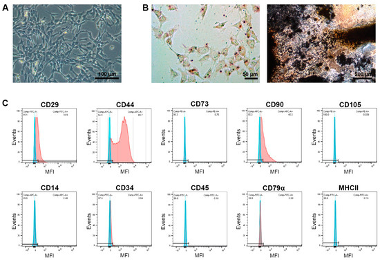 Characterization of mesenchymal stromal cells (MSCs). Phase-contrast microscopy displays the morphology of the undifferentiated cells (A), and light microscopy displays the cells after adipogenic differentiation and oil red O staining (left) and osteogenic differentiation and von Kossa staining (right) (B). The histograms display the flow cytometric analysis of the MSCs after monoclonal antibody staining of the respective marker antigens (red) and corresponding isotype controls (blue) (C). The images and data shown here were obtained from MSCs after thawing and expansion, corresponding to the cells used for treatment.