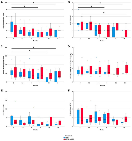Clinical and image parameters. Follow-up examinations were performed over a time period of 18 months after treatment of early naturally occurring equine tendon lesions with either allogeneic mesenchymal stromal cells (MSCs) in serum or serum alone. Clinical inflammation scores (A) and lameness scores (B) were obtained using blinded clinical examinations. The B-mode ultrasonography score (C), the normalized TSCA (tendon cross-sectional area) (D), the % vascularized area (E), and the normalized % altered tissue (echo types II, III and IV) (F) were obtained through the blinded (semi)quantitative analysis of ultrasound-based imaging (CDU: color Doppler ultrasonography; UTC: ultrasound tissue characterization). The 0-month examinations were performed directly before the horses were treated with MSCs and/or serum. The asterisks (*) mark significant differences over time in the MSC group, and the hashtag (#) indicates significant differences in the serum control group (p < 0.05; Friedman tests and Bonferroni-corrected post hoc tests).