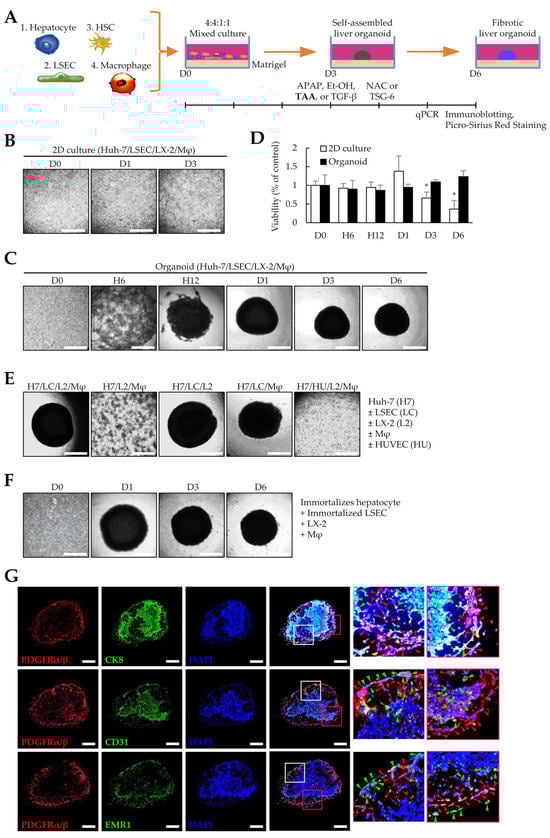 Liver organoids generated by multiple cells. To generate self-assembled liver organoids, Huh-7, liver sinusoidal endothelial (LSECs), LX-2, and macrophage cells were seeded in a Matrigel-coated 96-well plate and cultured for three days. Fibrotic liver organoids were produced by thioacetamide (TAA) treatment for an additional three days. (A) Schematic diagram of the experimental protocol. (B) Representative images of 2D-cultured cells at the indicated time points (days 0–3). The medium was replaced with fresh medium every two days. (C) Representative images at indicated time points (days 0 to 6). The self-assembled liver organoid was cultured for six days without subculturing while exchanging with fresh medium every two days. (D) Viability of 2D-cultured cells and organoids up to six days. * p < 0.05. (E) Cells required for self-assembly of liver organoids. Liver organoids were prepared by excluding one cell type from the Huh-7, LSECs, LX-2, and macrophage cells or by replacing LSECs with human umbilical vein endothelial cells (HUVECs). (F) Images of representative liver organoids generated using immortalized primary hepatocytes and LSECs instead of Huh-7 and LSECs. Scale bar for (B,C,E,F): 1 mm. (G) Immunofluorescence images of liver organoids. To evaluate the cell distribution, antibodies against CK8, CD31, EMR1, and PDGFRα/β were applied to liver organoid sections obtained from day 6 without TAA treatment to detect Huh-7, LSECs, macrophages, and LX-2 cells, respectively. Red arrowheads indicate PDGFRα/β-positive cells. Green arrowheads indicate CK8-, CD31-, or EMR1-positive cells. Scale bars: 500 µm. Data shown for (B–G) are representative of three independent experiments.