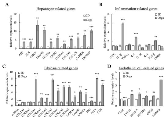 Gene expression profiles in 2D- and 3D-cultured cells. The four cell types were cultured for three days in 96-well plates without or with Matrigel for 2D or 3D cultures, respectively. Gene expression was analyzed using qPCR. (A) Hepatocyte-related gene expression profiles in 2D- and 3D-cultured cells. (B) Inflammation-related gene expression in 2D- and 3D-cultured cells. (C) Extracellular-matrix-related gene expression in 2D- and 3D-cultured cells. (D) Endothelial-cell-related gene expression in 2D- and 3D-cultured cells. Target gene expression was normalized using GAPDH expression. Relative fold changes in mRNA expression were measured using the 2−(ΔΔCt) method. The results are presented as the means ± standard deviation (SD) of three replicates. * p < 0.05, ** p < 0.01, and *** p < 0.001. 2D; two-dimensional-cultured cells, Orga; 3D-cultured liver organoid.
