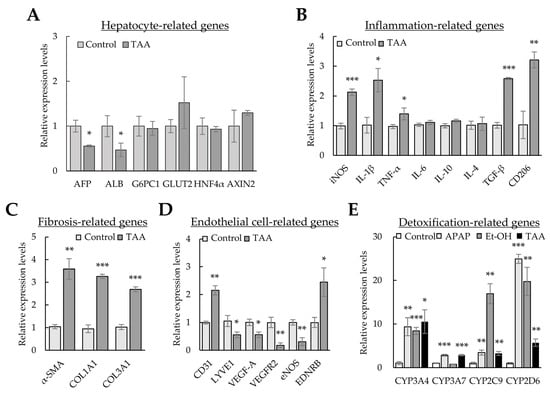 Gene expression profiles using liver toxicants. Liver organoids on day 3 were treated with the liver toxicants thioacetamide (TAA), ethanol (Et-OH), and acetaminophen (APAP) for an additional two days. Gene expression was analyzed using qPCR. (A) Hepatocyte-related gene expression profiles in TAA-treated liver organoids. (B) Inflammation-related gene expression in TAA-treated liver organoids. (C) Extracellular matrix (ECM)-related gene expression in TAA-treated liver organoids. (D) Endothelial-cell-related gene expression in TAA-treated liver organoids. (E) Expression of CYPs in toxicant-treated liver organoids. GAPDH expression was used to normalize the expression of target genes. The 2−(ΔΔCt) method measured relative fold changes in mRNA expression. The results are presented as the means ± SD from three replicates. * p < 0.05, ** p < 0.01, and *** p < 0.001.