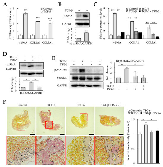 Antifibrotic effects of tumor-necrosis-factor-stimulated gene 6 protein (TSG-6) in TGF-β-treated liver organoids. Liver organoids on day 3 were treated with TGF-β, and TSG-6 was added on day 4. qPCR or immunoblotting and Picro-Sirius Red staining were conducted on samples prepared on day 5 or 6, respectively. (A) Fibrotic marker expression in TGF-β-treated liver organoids. The expression of α-SMA, COL1A1, and COL3A1 was analyzed using qPCR on day 5. (B) α-SMA expression in TGF-β-treated liver organoids. (C) Antifibrotic effects of TSG-6 in TGF-β-treated liver organoids. The expression of α-SMA, COL1A1, and COL3A1 was analyzed using qPCR. qPCR (A,C) was conducted on day 5 samples, and target gene expression was normalized using GAPDH expression. Relative fold changes in mRNA expression were measured using the 2−(ΔΔCt) method. (D) Decreased expression of α-SMA by TSG-6 in TGF-β-treated liver organoids. (E) SMAD3 phosphorylation reduction by TSG-6 in TGF-β-treated liver organoids. Data in (A–E) are presented as the means ± SD of three independent experiments. * p < 0.05, ** p < 0.01, and *** p < 0.001. (F) Collagen expression in fibrotic liver organoids treated with TSG-6 on day 6. Collagen in liver organoids was stained with Picro-Sirius Red solution, and images were analyzed using light microscopy. Data shown are representative of three independent experiments. The black stars indicate areas rich in collagen. Scale bars: 50 µm.