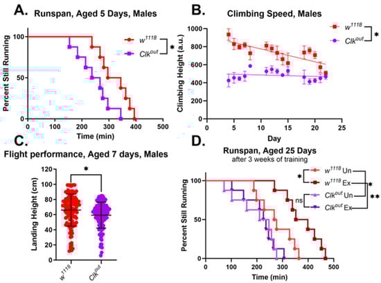 Clkout mutants have impaired performance in multiple mobility associated assessments. Clkout mutant males showed reduced endurance even at five days of age compared to background controls (A). Each data point depicts time to exhaustion for 80% of flies in an individual vial (n = 8 vials of 20 flies each) analyzed via log rank. Clkout mutants also have reduced climbing speed across the first three weeks of life (B). Each data point represents the average climbing speed over four pictures taken daily (n = 5 vials of 20 flies each) analyzed longitudinally via a two-way ANOVA. The trend line represents the slope of linear regression. The flight performance of Clkout mutants is also reduced (C). Average landing height between the two groups (n = 8 vials of 20 flies each) was compared using a t-test. Clkout mutants showed no improvement in endurance following three weeks of chronic exercise training while the control w1118 flies showed a significant improvement, n = 8 vials of 20 flies each (D). * p < 0.05, ** p < 0.001, ns is not significant.