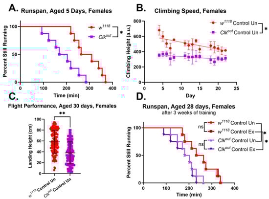 The mutants also had a lower climbing speed than controls during all three weeks of the climbing speed assessment, beginning at five days of age (Figure 1B). Because of these more severe and consistent phenotypes, we focused on the Clkout mutant for further experimentation. The flight performance of these mutants was evaluated, and the mutants were found to have worse flight performance than controls at seven days of age (Figure 1C). We also evaluated the performance of females in the same assessments. Female mutants, like males, were found to have significantly worse endurance when compared to w1118 controls (Figure 2A) and were found to have reduced climbing speed and flight performance, similar to males (Figure 2B,C).