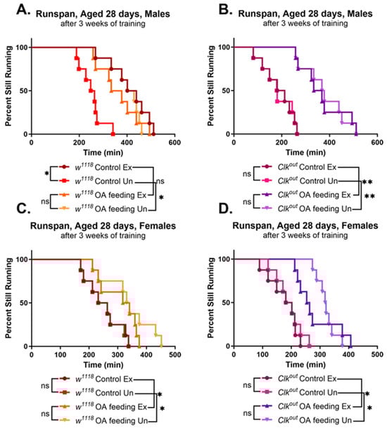 We chose to rescue through the feeding of octopamine (OA), an invertebrate norepinephrine equivalent. We have previously shown that wild-type females do not respond to exercise training, and this difference is entirely due to sex differences in the activity of OA-ergic neurons during training []. OA release is critical for the response to chronic training, and the feeding of OA alone is able to mimic the effects of endurance exercise in both male and female wild-types []. As previously observed, in both male and female w1118 flies, OA feeding mimicked the improvements in run span induced by exercise training (Figure 3A,C). Furthermore, OA feeding was able to rescue the endurance of Clkout mutants, leading to significant improvements in run span regardless of training status (Figure 3B), while vehicle-fed controls retained the defects as in Figure 1. The results in female mutant flies were similar to males (Figure 3D).