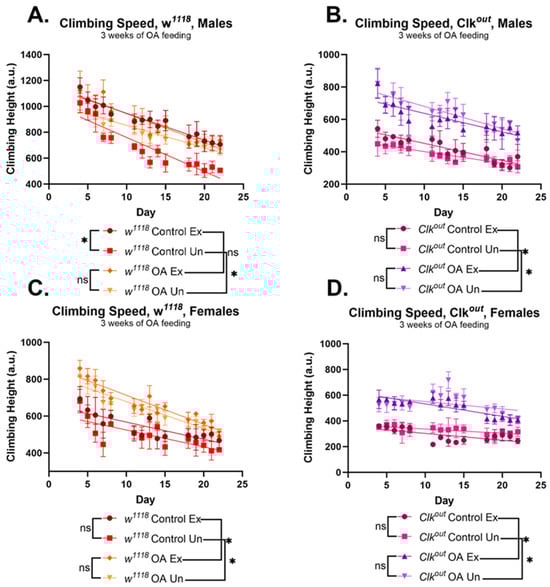 OA feeding also led to significant improvements in the climbing speed of both w1118 and Clkout flies. Wild-type control males improved climbing speed with either training or OA feeding, with no additive effect between the two treatments (Figure 4A,C), similar to previous observations []. OA feeding caused significant improvements in the climbing speed of Clkout mutants, (Figure 4B,D) in contrast to exercise training, which did not improve the mutants’ climbing speed, regardless of sex (Figure 4B,D). However, the flight performance phenotype of Clkout was not rescued by OA feeding (Supplemental Figure S3).