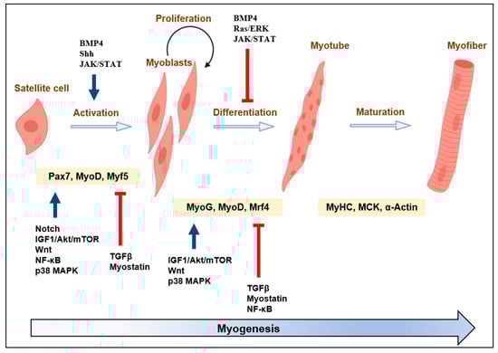 Skeletal muscle is an abundant tissue, constituting about 40% of human body weight, and is critical for various vital functions, including locomotion, force generation, energy storage, respiration, and metabolism [1,2]. Maintaining skeletal muscle homeostasis relies on the intricate process of myogenesis, which is pivotal for the development, growth, and regeneration of skeletal muscle fibers [3]. This process is meticulously orchestrated by multistage events encompassing progenitor cell proliferation, activation of myogenic factors, differentiation, and the fusion of cells to form myotubes (Figure 1). Moreover, these sequential events are further regulated by complex networks that govern intercellular signaling and expression of myogenic regulatory factors (MRFs) [4,5]. Hence, dysregulation of skeletal myogenesis results in muscle wasting, characterized by an overall decline in muscle mass, strength, quality, and regenerative capacity [6,7]. In this aspect, MRFs and their functional modulators have been studied as promising targets for various muscular disorders. For many years, numerous classical signaling molecules and canonical signaling pathways, such as PI3K/Akt/mTOR [8], p38 MAPK [9], TGFβ/myostatin/activin [10,11], Wnt [12,13], Notch [14], BMP [12,13], Shh [12,13], JAK/STAR [15], and NF-κB [16], have been suggested as master regulators of skeletal myogenesis via modulating MRFs expression. However, in spite of these efforts, treating muscle wasting remains challenging due to its complexity and lack of understanding. Therefore, insight into skeletal myogenesis from a molecular and cellular level can contribute to developing novel therapeutic strategies against muscle atrophy by identifying specific target molecules and pathways.