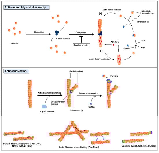 The actin cytoskeleton is characterized by its remarkable capacity for continuous restructuring through the processes of actin polymerization and depolymerization. Actin polymerization involves the addition of ATP-actin monomers (globular actin or G-actin) at the rapidly growing barbed end (+end). In contrast, ADP-actin monomers are consistently released from the slowly growing pointed end (-end) of the elongated actin polymers (filamentous actin or F-actin) [23,24,25]. This dynamic assembly and disassembly of actin filaments are strictly regulated both spatially and temporally by ABPs, which are crucial components for maintaining the balance between cellular G-actin and F-actin [23,24,25]. Thus, the intricate interplay between actin dynamics and ABPs ensures the precise control of cellular architecture and function. Approximately a quarter of all cellular proteins are attributed to ABPs, and these proteins can be classified into conserved families based on their specific cellular functions on actin dynamics (as depicted in Table 1 and Figure 2).