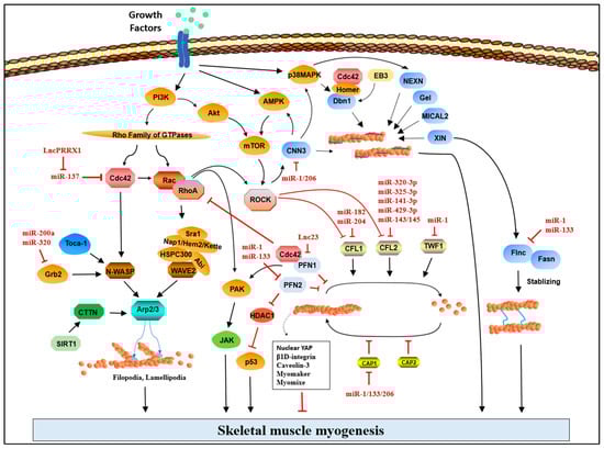 Over the last decade, there has been a growing understanding of the relationship between mechanotransduction, which is the conversion of mechanical stimuli into biochemical signals, and the dynamic properties of the actin cytoskeleton during skeletal myogenesis. Actin dynamics, including actin polymerization, depolymerization, and a range of other cytoskeletal processes, not only facilitate physical changes necessary for cellular structural reconfiguration but also initiate mechanotransduction, which activates myogenic genes and differentiates progenitor cells [17,18]. This complicated connection significantly impacts myogenic transcription programs, cytoskeletal organization, cell proliferation, and differentiation [19,20]. Consequently, dynamic reconfiguration of actin filaments alters cell morphology, allowing myoblasts to change flattened shapes and subsequent merging of cell membranes, which facilitates myoblast fusion [20,21,22]. As a key point to emphasize, a large number of actin-binding proteins (ABPs) control actin dynamics, including polymerization, monomer sequestration, depolymerization, nucleation, capping, budding, cross-linking, and stabilization [23]. From this perspective, ABPs are now recognized as critical players in skeletal myogenesis via mechanotransduction, which triggers proliferation, migration, differentiation, and morphogenesis in cells [20,21,22]. This review aims to comprehensively summarize the functions of ABPs in skeletal muscles, emphasizing recent advancements concerning myogenesis and their implications in muscular disorders. In addition, ABPs in the myogenic process are also known to be modulated by many epigenetic modifiers, particularly non-coding RNAs (ncRNAs), including long non-coding RNAs (lncRNAs) and microRNAs (miRNAs). In this context, we also provide evidence that ncRNAs have an influence on the expression of ABP genes, thereby affecting actin cytoskeleton dynamics and myogenesis.