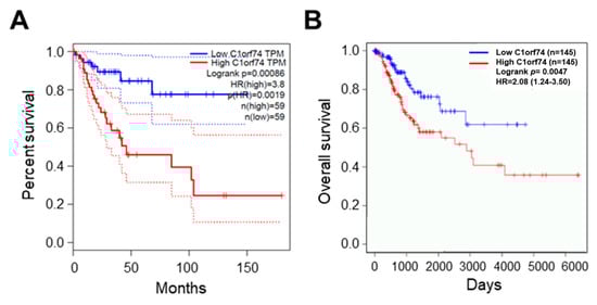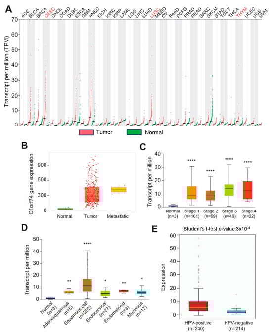 2.2. Expression Level of the C1orf74 Gene in Different Types of Cancers