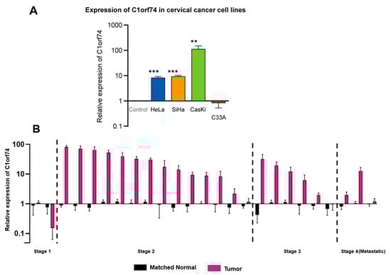 3.3. C1orf74 Expression in Cervical Cancer Cell Lines and Patient Tumor Samples