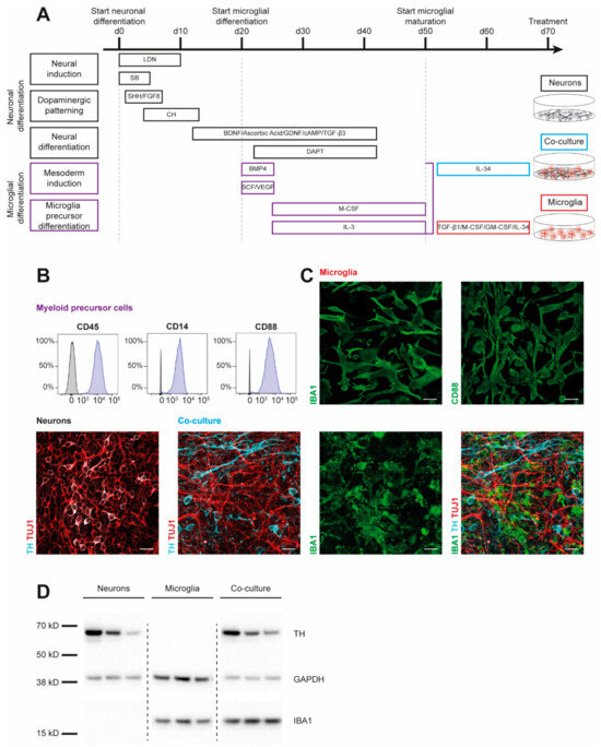Characterization of iPSC-derived dopaminergic neurons, microglia, and co-cultures. Results are shown for three iPSC lines derived from healthy individuals (SFC086-03-03, SFC089-03-07, and SCF156-03-01). (A) Differentiation schemes are shown for microglial (MG) and dopaminergic neuronal (DAN) monocultures, and a combined co-culture (co-DAN-MG). Protocols are based on published methods [15,16,17,18,19]. (B) Flow cytometry analysis of the surface markers cluster of differentiation (CD) 14, 45, and 88 in myeloid precursor cells (purple) and iPSC (grey). Images are representative of n = 10 independent differentiation experiments. (C) Immunofluorescence staining for microglial ionized calcium-binding adaptor molecule 1 (IBA1) (green), CD88 (green), neuron-specific β-III tubulin (TUJ1) (red), and the dopaminergic marker tyrosine hydroxylase (TH) (cyan). Images are representative of n = 10 independent differentiation experiments. Scale bar, 25 μm. (D) Western blot analysis of IBA1 and TH marker proteins and loading control GAPDH in the three different cultures derived from the three iPSC lines. Whole blots are shown in Figure S4.