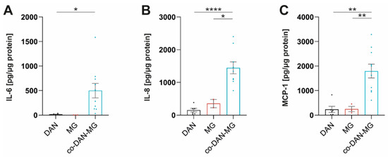3.3. IL-1β Stimulates co-DAN-MG but Not MG or DAN Monocultures to Release MCP-1, IL-6, and IL-8
