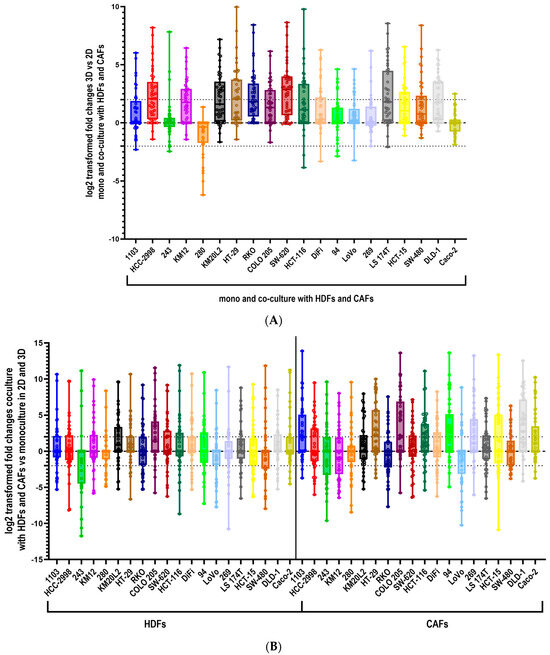 Cytokines secretion is positively regulated in 3D spheroid cultures and coculture with fibroblasts compared to 2D culture and monoculture. (A) Log2 transformed fold changes 3D vs. 2D monoculture and coculture with HDFs and CAFs. The graph shows pooled data from mono- and coculture with HDFs and CAFs to highlight the different cytokine expression between the 3D and 2D settings. (B) Log2 transformed fold changes coculture with HDFs and CAFs vs. monoculture in 2D and 3D. 1 × 10⁴ colon cancer cell lines (15 commercial lines and five PDX-derived) were cultured in 2D culture and 3D spheroids culture in monoculture and coculture with 6 × 103 human dermal fibroblasts (HDF) and cancer-associated fibroblasts (CAFs). Supernatants were harvested on day 6 for the 3D culture and day 3 for the 2D culture setting. The expression of 45 cytokines was determined with a human-specific magnetic bead-based assay. The fold changes of the cytokine expression were calculated between 2D and 3D setting in mono- and coculture with HDFs and CAFs and between monoculture and coculture across 2D and 3D with both types of fibroblasts.