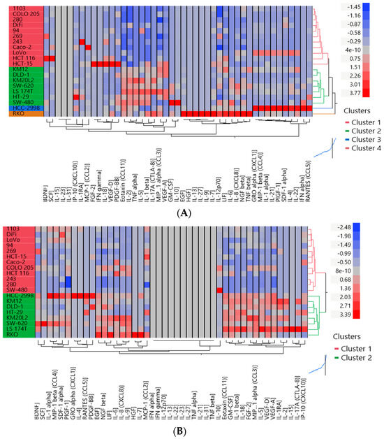 Cytokine profiles of 20 CRC cell lines in 3D spheroid cultures in monoculture and in coculture with HDFs. (A) Heat map of the cytokine levels (pg/mL) in 3D spheroids monoculture. (B) Heat map of the cytokine levels data (pg/mL) in 3D spheroids coculture with HDF. (C) Heat map of the fold changes 3D coculture with HDFs vs. 3D monoculture. Before clustering, (A,B) heatmap values were standardized together, (C) heatmap values were standardized separately. Hierarchical clustering (Method = Ward) is shown. n = 2.
