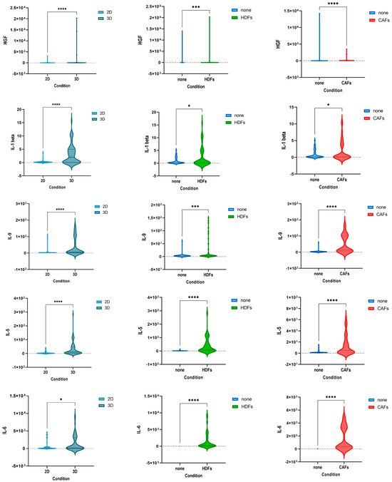A detailed analysis of individual cytokine levels revealed that specifically cytokines with pro-inflammatory, pro-angiogenic and tumorigenic capabilities were elevated in 3D and coculture. Among them, EGF, HGF, PIGF-1, GM-CSF, IL-5, IL-9 and IL-6 were exclusively secreted in 3D and in coculture with HDFs and CAFs (Figure S2A).