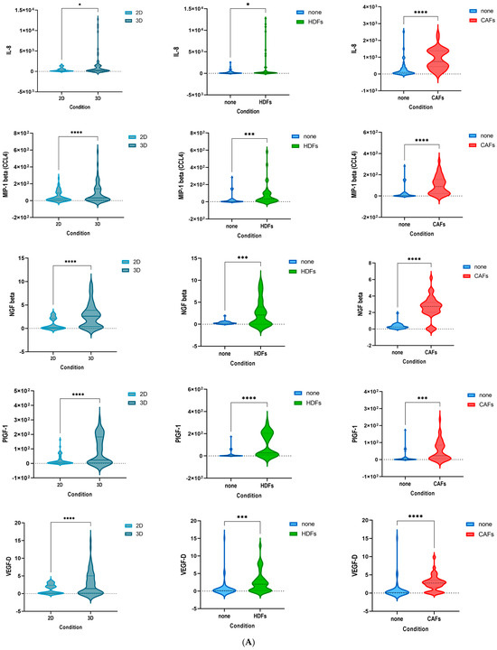 Of the secreted factors, 14 were statistically significantly upregulated in 3D vs. 2D and in coculture with HDFs and CAFs vs. monoculture (Figure 3A). Moreover, the differences of 26 other cytokines were statistically significant in the comparison 3D vs. 2D and/or coculture with one type of fibroblasts (HDFs and CAFs) vs. monoculture (Figure S3A,B). To summarize, a total of 40 out of 45 cytokines were statistically significantly upregulated in at least one analysis. A comparison between the cytokine modulation between both types of fibroblasts in 2D and 3D demonstrated that HDFs and CAFs had a similar effect on the cytokine profile: for 70% of the cytokines the change in expression was independent of the source of the fibroblasts (Figure 3B).