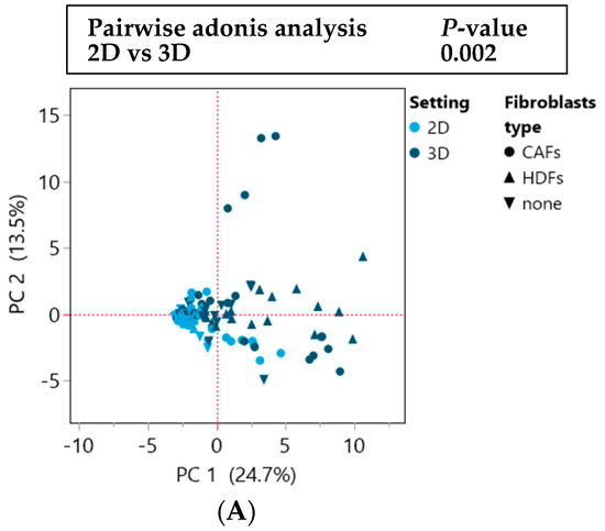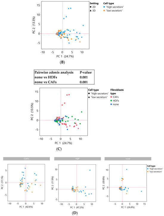 This effect was particularly evident for the tumor lines recognized as high secretor, whereas the low secretor cell lines grouped closer together regardless of the culture setting (Figure 4B). This was confirmed in the comparison between the monoculture and the coculture with fibroblasts, where the divergence between the individual CRC lines in the group of the high secretors in coculture with both types of fibroblasts was increased (Figure 4C,D). Of note, principal components 1 high vs. low secreting tumor lines were statistically significant in the comparisons 3D vs. 2D and coculture (HDFs) vs. monoculture (Figure S4B,E).