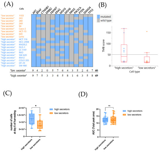 Comparison of tumor-intrinsic factors between the high and low secretor CRC tumor cell lines. (A) Mutational frequencies (WES data) of cancer specific genes of the CRC cell lines. (B) Kruskal–Wallis test (rank sums) between the TMB scores of the two groups. (C) Calculated number of cells present at day 6 in the 2D culture setting of the two groups of cell lines based on the doubling times of each cell line. (D) Proliferation rate of the cancer cells in the 3D spheroids culture setting. AUC of the largest brightfield object areas (µm2) of the spheroids in monoculture for both groups are shown. (C,D) Error bars represent SEM, p-values * <0.05, ns non significant of Mann–Whitney test (nonparametric comparison test) are illustrated.