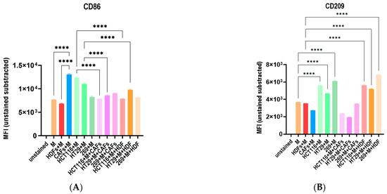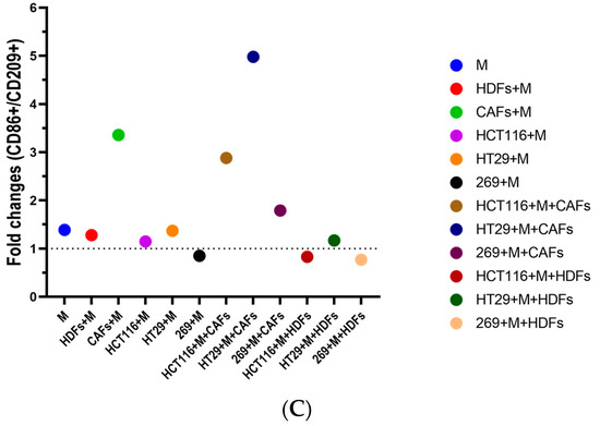 Determination of macrophage phenotype in 3D. 1 × 10⁴ colon cancer cell lines (HCT-116, HT-29 and 269) and 6 × 103 of two fibroblast lines, human dermal fibroblasts (HDFs) or cancer-associated fibroblasts (CAFs) were cultured together in ultra-low adhesion (ULA) round-bottom 96-well plates for 2 days. On day 3, 5 × 10⁴ macrophages from healthy donors were added to the wells as mono-, co- and triple cultures after resuspension in a matrigel–collagen matrix. After 6 days the polarization of the macrophages was examined by flow cytometry (FC) based on the expression of CD45, CD11b, CD86 and CD209. (A,B) CD86 and CD209 MFIs are indicated in the bar graph. MFI of unstained sample was subtracted from the other samples. n = 10; M = Macrophages; CAFs = Cancer associated fibroblasts; HDFs = Human dermal fibroblasts. Error bars represent SEM, p-values **** < 0.0001 of one-way ANOVA (Holm–Šídák multiple comparison test) are illustrated. (C) Fold changes of the CD86+/CD209+ mean fluorescence intensities (MFI) are illustrated.