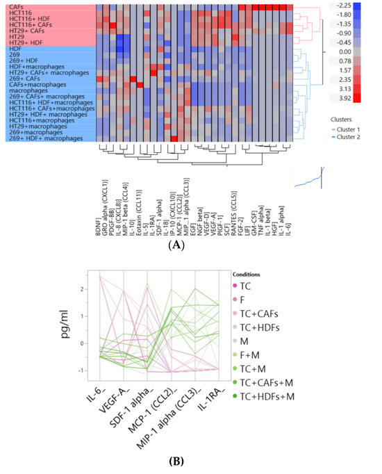 Taken together, we have thoroughly characterized the cytokine profile of 20 CRC lines recapitulating the heterogeneity of the disease in different in vitro culture conditions including two types of fibroblasts, HDFs and CAFs, as well as macrophages, as a major representative of the TME.