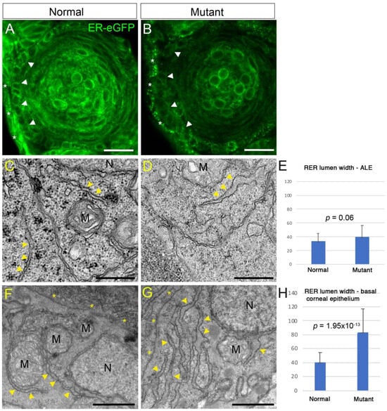Abnormal rough endoplasmic reticulum (RER) in plod3 mutants. (A,B) Single confocal sections from eyes of 2 dpf normal (A) and mutant (B) embryos expressing ER-eGFP. Arrowheads point at the ALE. Asterisks mark the presumptive cornea. Scale bars are 20 µm. (C,D,F,G) Transmission electron microscope images of ALE cells (C,D) and basal corneal epithelial cells (F,G) from 2 dpf normal (C,F) and mutant (D,G) embryos. Arrowheads point at RER. Asterisks in (F,G) are located by the basal cell membrane, next to the developing corneal stroma in (F), which is missing in (G). M, mitochondrion; N, nucleus. Scale bars are 500 nm (C,D) or 1 µm (F,G). (E,H) Graphs depicting measurements of RER width from mutant and normal cells in the ALE (E) or basal corneal epithelial cells (H). Numbers on the Y axis are width in µm. Error bars are standard deviation. p values are depicted.