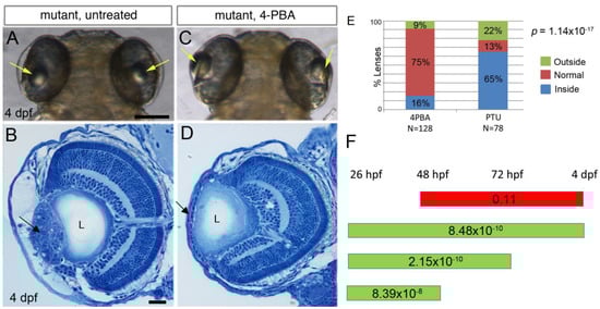 The evidence for the presence of RER abnormalities that are consistent with ER stress prompted us to check whether inhibition of ER stress could block the formation of cellular masses in lenses of plod3 mutants. Therefore, we treated zebrafish embryos from a cross between heterozygous plod3vu222 parents with 4-Phenylbutyric acid (4-PBA), an FDA-approved drug used to treat urea cycle disorders. 4-PBA is a chemical chaperon known to alleviate ER stress [] and also has a histone deacetylase (HDAC) inhibitor activity []. We treated embryos from 26 hpf until 4 dpf and assessed their lens phenotype. This treatment resulted in a significant rescue of the lens phenotype, as evidenced by localization of the lenses in live larvae (Figure 2A,C,E). Histological sections confirmed that in correctly localized lenses, the ALE remained a monolayer, without overt evidence of abnormalities (Figure 2D). The shape of the lens was abnormal, with lateral bulges, suggesting that the lens capsule was still defective (Figure 2D) (compare to a wild-type lens, Figure S2).