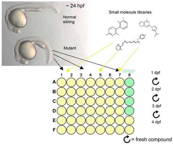 Design of the small molecule screen: Top left panel shows normal (top) and plod3 mutant embryos at approximately 24 hpf. Mutants can be identified by their transient ventral curvature which is evident at this stage. Mutants were placed in 48-well plates, 5 per well, and compounds from the small molecule libraries were added and replaced daily until 4 dpf. Several wells in each plate were treated with DMSO as control.
