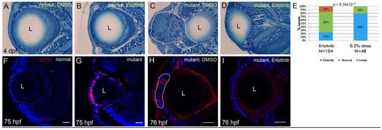 Erlotinib binds the intracellular catalytic domain of EGFR tyrosine kinase and inhibits EGFR phosphorylation. It is used in treatment of several types of cancer as it blocks cell cycle progression by causing G1 arrest []. Following treatment with Erlotinib from 26 hpf until 4 dpf, development of cell masses in lenses of plod3 mutant larvae was efficiently inhibited and lens localization was rescued (Figure 4A–E).