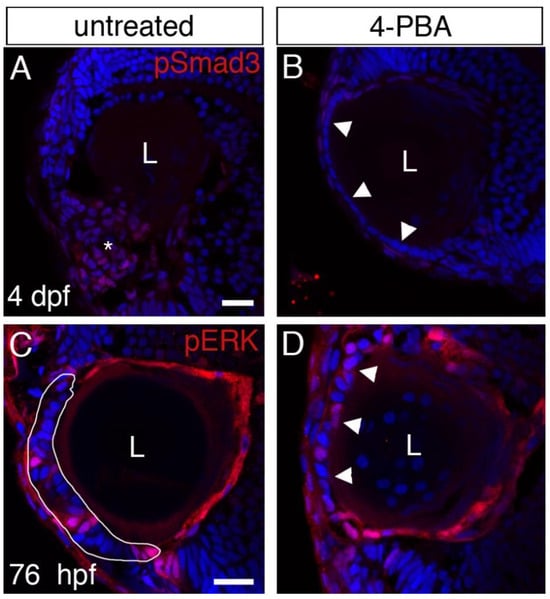 First, we treated mutant embryos from 26 hpf to 4 dpf and labeled eye tissue sections for pSmad3. We chose 4 dpf to assess the effect on TGFβ signaling since at this time point pSmad3 was consistently and clearly upregulated. We found that 4-PBA treatment blocked cell mass formation and no pSmad3-positive cells were present in the ALE (Figure 6A,B; n = 8 and 15, respectively). Some pSmad3-positive cells were present in adjacent cells, such as in the ciliary marginal zone (CMZ), as often observed in normal larvae (Figure 6B).