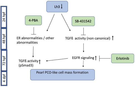 A schematic of pathways involved in plod3 mutant lens phenotype and small molecules that block phenotype development. Reduced function of Lh3 leads to ER abnormalities and possibly additional abnormalities by 2 dpf. Application of 4-PBA by ~28 hpf blocks phenotype development, likely by affecting these abnormalities. The TGFβ type I receptor inhibitor SB-431542 also blocks phenotype development if applied by ~28 hpf, suggesting early upregulation of non-canonical TGFβ signaling, as pSmad3 is not present before 3 dpf. Later on, around 72 hpf, increased EGFR signaling contributes to phenotype development downstream of TGFβ signaling, and blocking it by Erlotinib prevents phenotype development. Also around this time, as the cell mass develops, pSmad3-positive cells become apparent but the upregulation of this canonical TGFβ signaling occurs at a time point when blocking the pathway no longer prevents phenotype development. pSmad3 upregulation is dependent on the earlier phase of TGFβ signaling, on EGFR signaling and is also inhibited by 4-PBA. Timing of pathway and inhibitor activity as deduced from our experiments is depicted. The dashed line after EGFR signaling represents the finding that EGFR activation alone does not appear to drive cell mass formation.