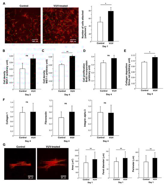 Fibroblast behavior and function on milled zirconia with or without VUV treatment. (A) The number of fibroblasts attaching to zirconia during the first day of culture. Representative fluorescence microscopy images and the number of attached cells counted on the images are shown. Cell density evaluated via WST-1 assay on days 2 (B) and 4 (C). (D) Cell proliferation evaluated via BrdU incorporation into DNA on day 4. (E) Collagen deposition evaluated on day 4. (F) The level of gene expression evaluated via real-time PCR. (G) Cytomorphometry. High magnification representative microscopic images of fibroblasts and measured metrics. * p < 0.05, ** p < 0.01, statistically different between the control and VUV-treated groups. ns: not significant.